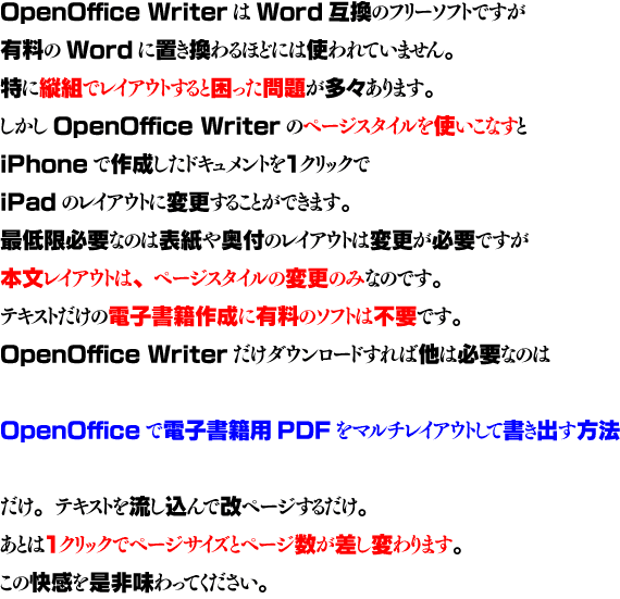 デバイスに合わせた電子書籍用PDFの作成は「OpenOfficeで電子書籍用PDFをマルチレイアウトして書き出す方法」にお任せください。