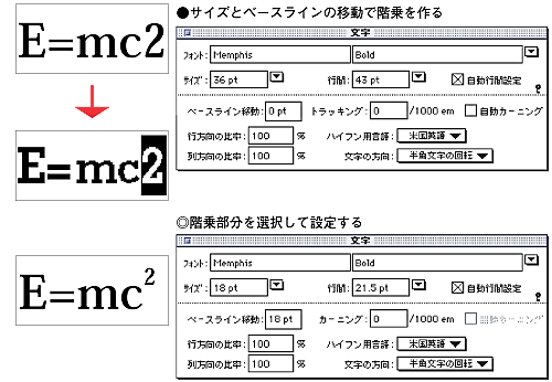 ベースラインの移動は、文字をベースラインからどのくらい移動するのかを設定します。一般的には階乗などでサイズ設定と合わせて使用します。行方向の比率と列方向の比率は写植で指定する長体平体の指定に使います。テキストを選んで行方向の比率を80%にすると長体2となります。また列方向の比率を80%にすると平体2の指定ができます。斜体をかける場合はツールボックスの中のシアーツールを使います。行方向の比率、列方向の比率はテキストの中の一部分を選択して(テキストを反転させて)設定できますが、斜体は文字設定ではないのでテキストポイント全体にしか設定できません。ハイフン用言語はパラグラフ設定の自動ハイフンを使う場合に設定します。自動ハイフンの設定は言語によって法則が異なるので、米国英語以外で自動ハイフンを使う場合にのみ設定が必要です。文字の方向は半角を含む縦書きの文字の場合のみ有効な設定です。「通常」を選ぶと縦書きの半角文字が全角として処理され、「半角文字の回転」では半角文字が90°回転して表示されます。「組み文字」の場合は必要な半角文字を指定すると横書きで表示されます。
