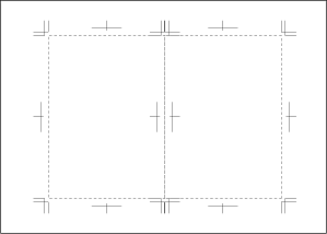 この台紙に上に、A4の割付データをペーストします。コピーする際にはまず、データのロックを解除します。つぎに割付で接する部分の塗り足しをマスクをかけてカットします。全てを選択しコピーして、クリップボード経由で台紙にペーストします。トリムマークのアンカーポイントをつまんでデータ全体をドラッグし、センタートンボで位置をセットします。隣のページも同様に割り付けます。4面で割り付ける場合は、A4連結のボックスを6mmピッチで垂直にコピーし、トリムマークを同様に作成します。アートワークの向きやノンブルの付け方は製本方法や折機によって異なるので作業工程の確認が必要となります。