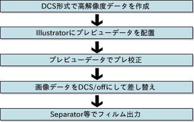 普通llustratorで出力する場合はDCSはoffにしなくてはなりません。IllustratorにDCS形式のファイルを配置すると、配置したファイルだけを参照し出力します。プレビュー用のファイルを配置してあると、プレビュー用の画像のみを貼り込んで出力します。プレビュー用の画像はPICT形式の72ppiのデータなので、元データが350ppiあっても72ppiのデータとして出力されます。